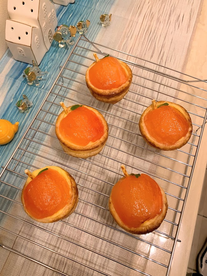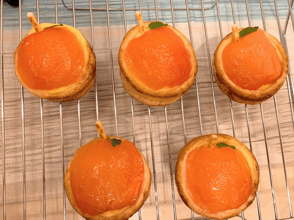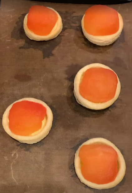 2枚を重ねたらフォークで穴をあける。何も乗せず、このまま180度に予熱したオーブンで8分焼く。 - パイ生地の中央の膨らみをつぶして、冷めたカスタードをたっぷり乗せる。