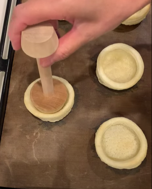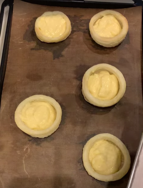 2枚を重ねたらフォークで穴をあける。何も乗せず、このまま180度に予熱したオーブンで8分焼く。 - パイ生地の中央の膨らみをつぶして、冷めたカスタードをたっぷり乗せる。