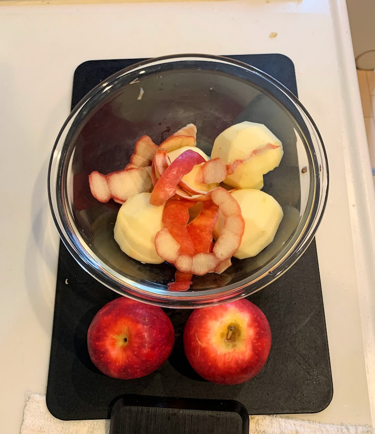 耐熱ボウルにりんごと皮、グラニュー糖、レモン汁入れて600wのレンジで5分加熱してそのまま粗熱を取る。