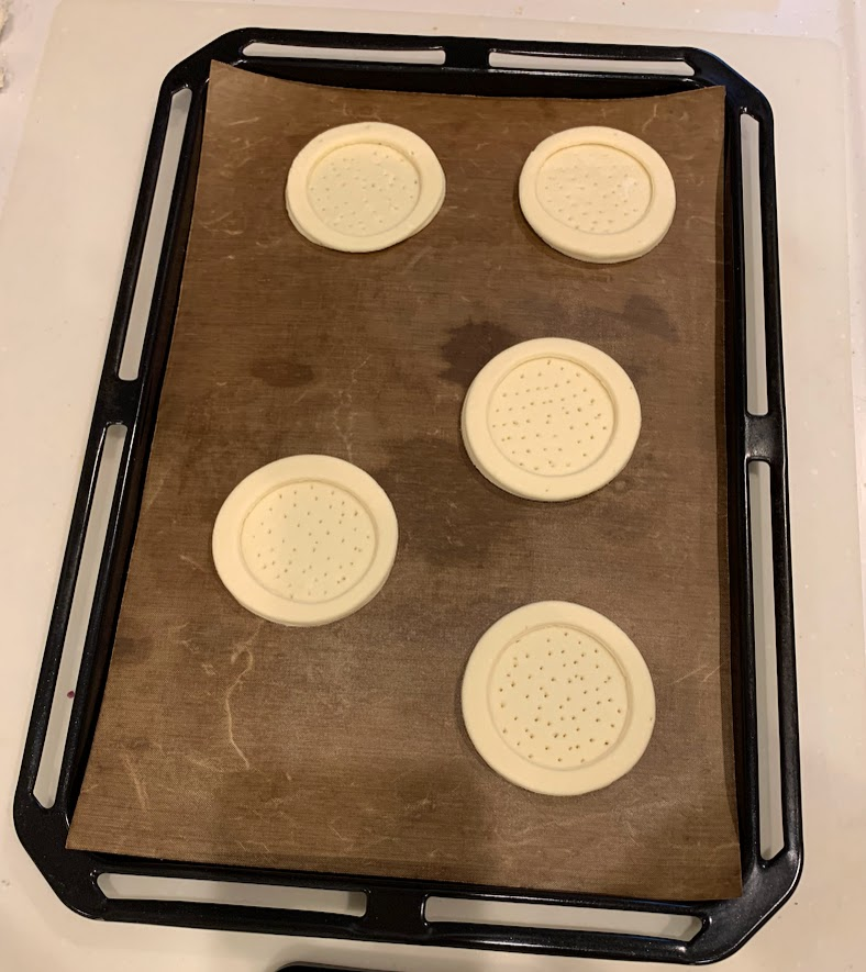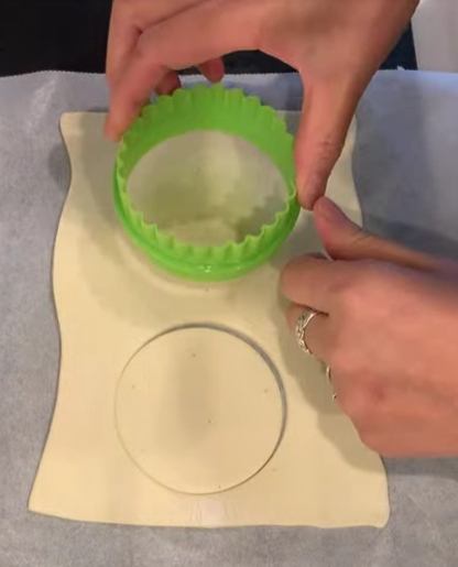 - 冷凍パイシートをめん棒で軽く伸ばして型で抜く。(大小2枚ずつ)